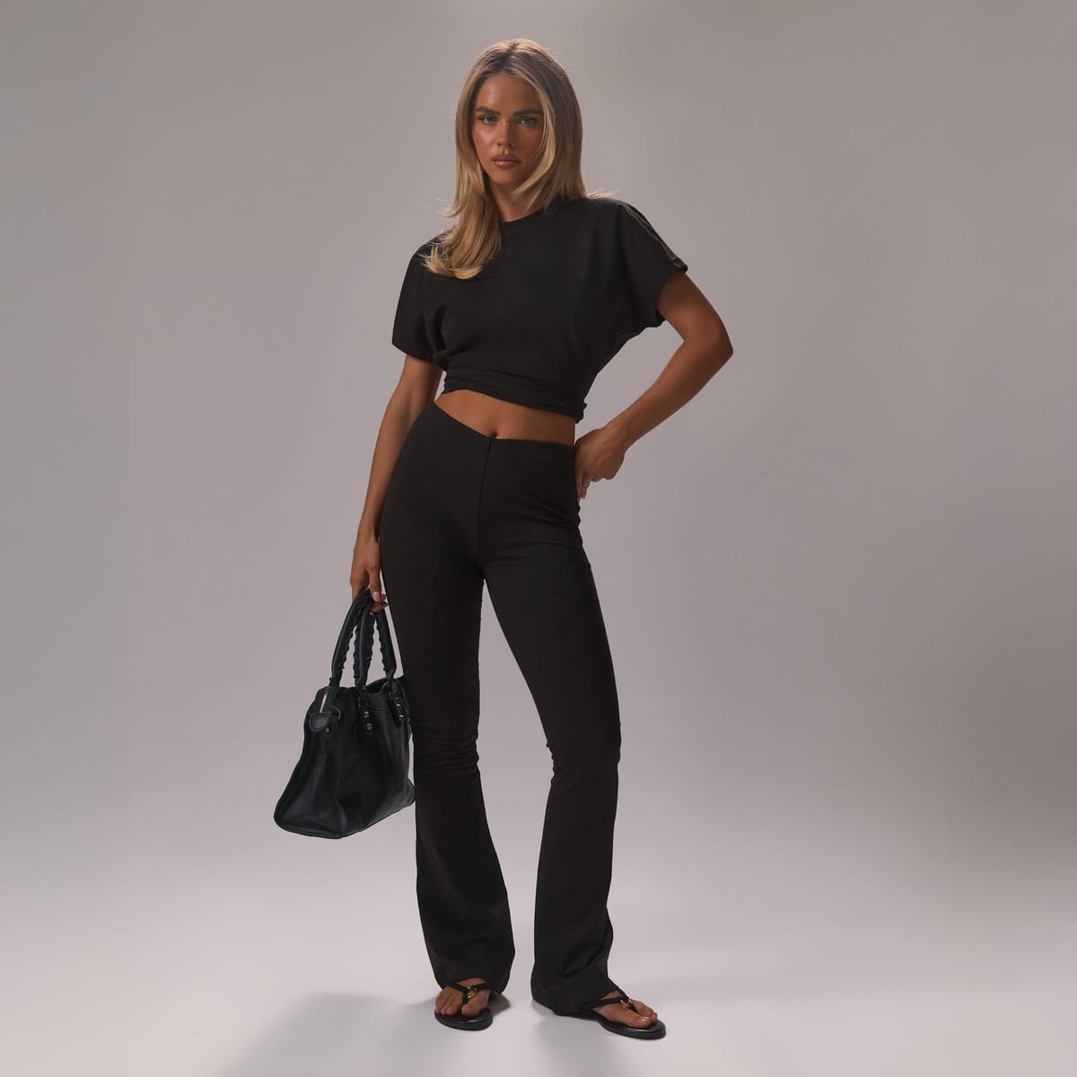 Elegant black woven trousers with a ruched back detail and a flared leg fit. Ideal for a night out with a corset top and stiletto heels.