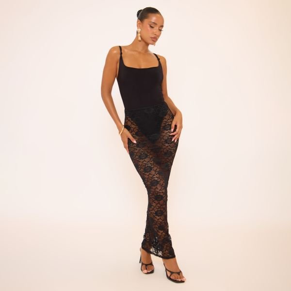 The EGO Bold Low Waist Detail Maxi Skirt in Black Lace is ideal for evening, party, casual.