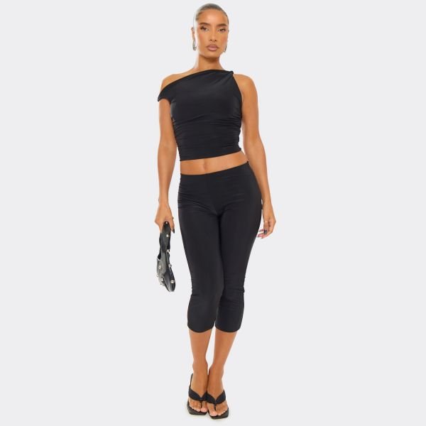Designed with black slinky, these mid rise capri leggings provide a sleek and chic vibe perfect for casual moments. Effortlessly versatile, they are ideal for turning everyday plans into statement looks.