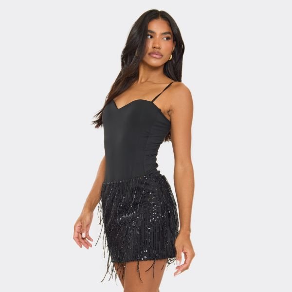 Turn up the glam in your winter date outfits with this black mini sequin skirt. Covered in shimmering sequins with playful tassel detailing, this skirt is the perfect piece to make any evening outing feel extra special. The mid-rise waist sits comfortably while flattering your silhouette, and the mini length shows off your legs in all the right ways.
