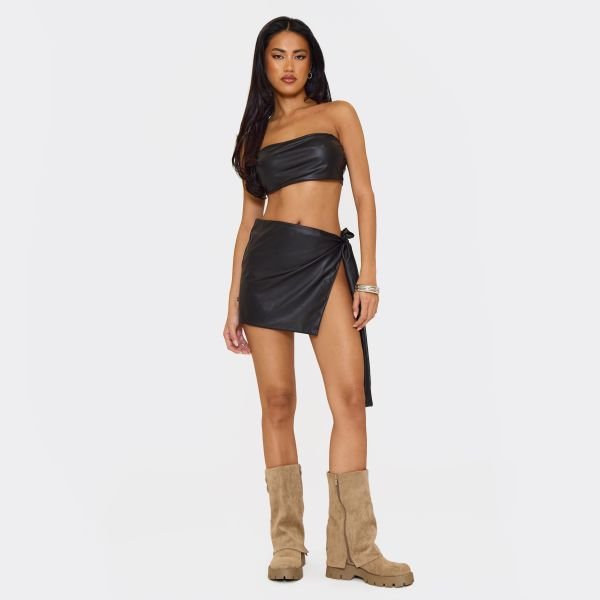 The EGO Mid Rise Tie Side Detail Mini Skirt in Black is available in sizes C06, C08, C10.