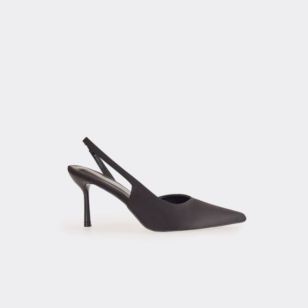 Chic-party vibes, doll. Featuring black satin material with pointed toe and slingback detailing, these court heels deliver on-trend it-girl energy. Style with a mini dress or tailored trousers for boss-babe confidence.