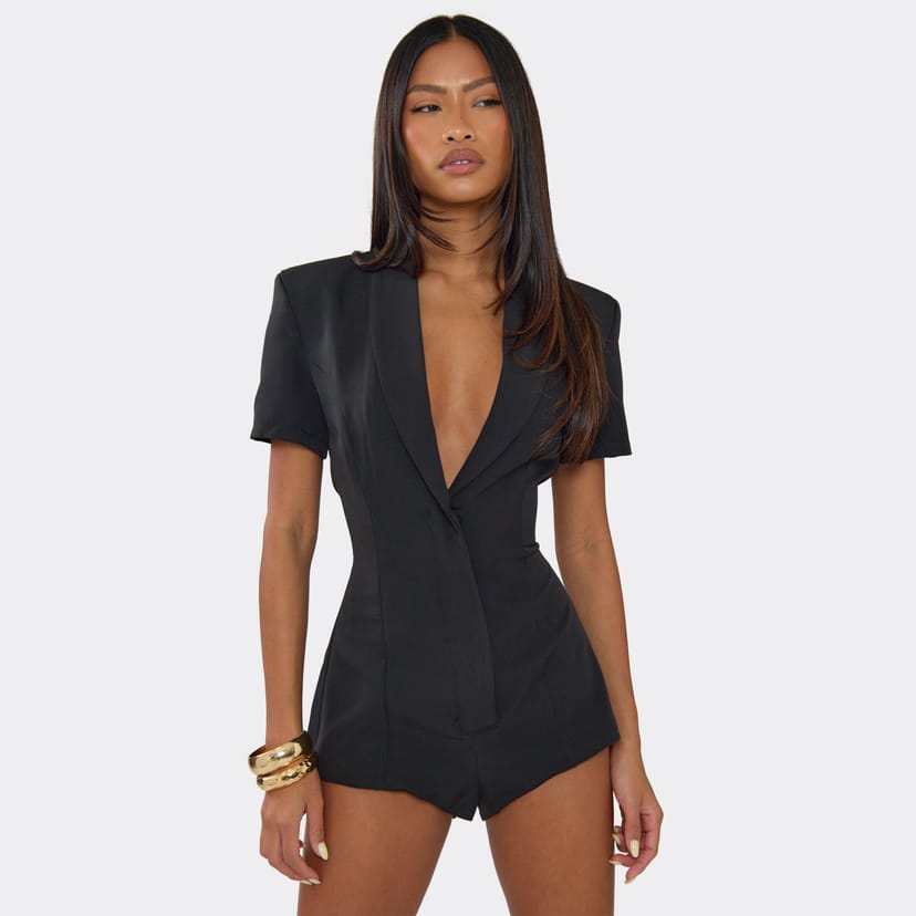 The EGO Black Woven Plunge Neck Blazer Playsuit is ideal for work, evening, date-night.