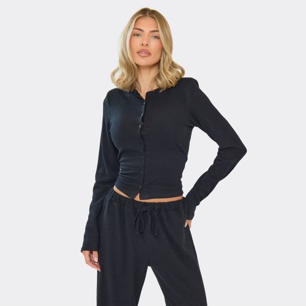 Meet the black ribbed button up top, structured, sleek and effortlessly versatile. With sharp shoulder-pad detailing and a fitted silhouette, this top elevates even the simplest outfits.