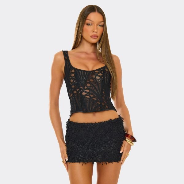 Designed with a sweetheart neckline, this black corset style top offers a tight fit and is crafted from stretchy, lacey fabric with a cropped length. Ideal for a sultry switch-up, it can be paired effortlessly with low-rise jeans for a night out.