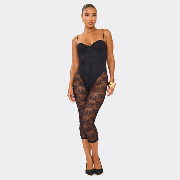 Turn evening styling into a statement with this black lace capri jumpsuit, designed in intricate lace with strappy underwire bodysuit detailing for a figure-flattering fit. The cropped leg length and tailored capri silhouette of this jumpsuit balance playful elegance with sleek structure, while soft, lightweight material ensures comfort for going out looks.