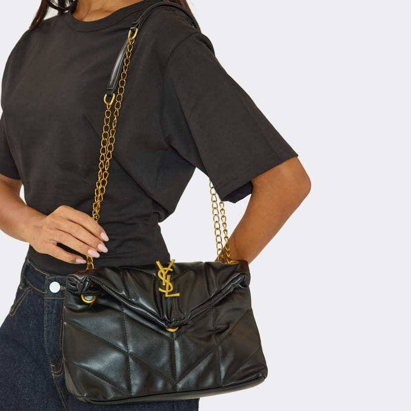 Elegant black faux leather bag featuring gold logo and chain strap with quilted detailing. Ideal for adding a touch of luxury to your outfit. Perfect for pairing with a bodycon dress and stiletto heels.
