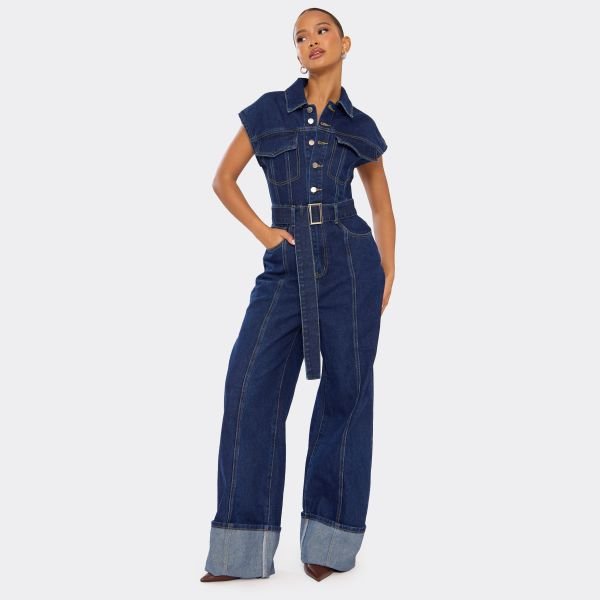 Own your denim moment in this belted denim jumpsuit, cut in soft indigo blue fabric with cap sleeves, a button-down front and a tie belt for perfect waist definition. The belted denim jumpsuit is a wardrobe standout, effortlessly cool for any occasion.
