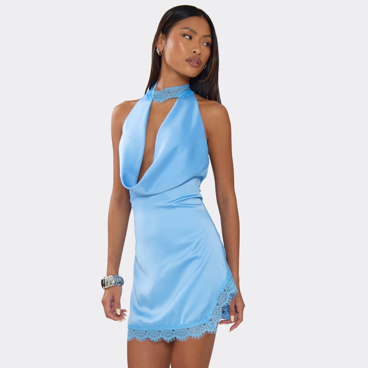 View EGO (UK)'s returns policyElegant blue satin mini dress featuring a cowl neckline and lace choker trim. Perfect for a night out or special occasion.