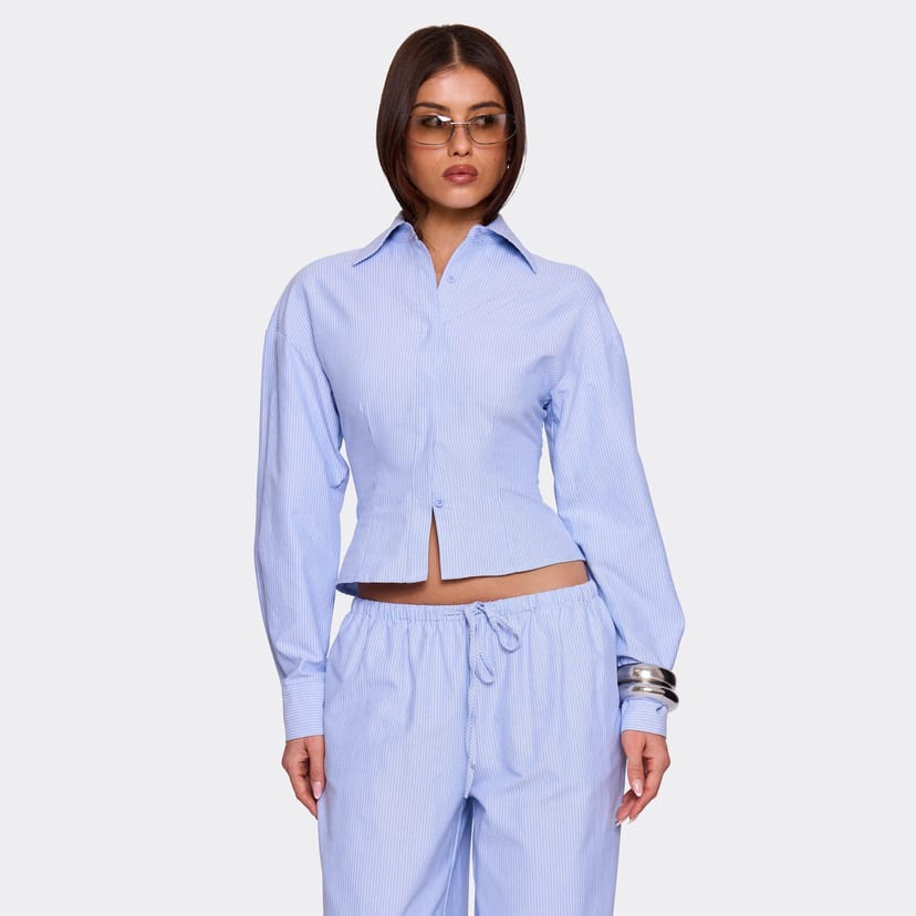 Elegant blue pinstripe cotton shirt with a button-up front and cinched waist. Ideal for transitioning from office to evening with ease.