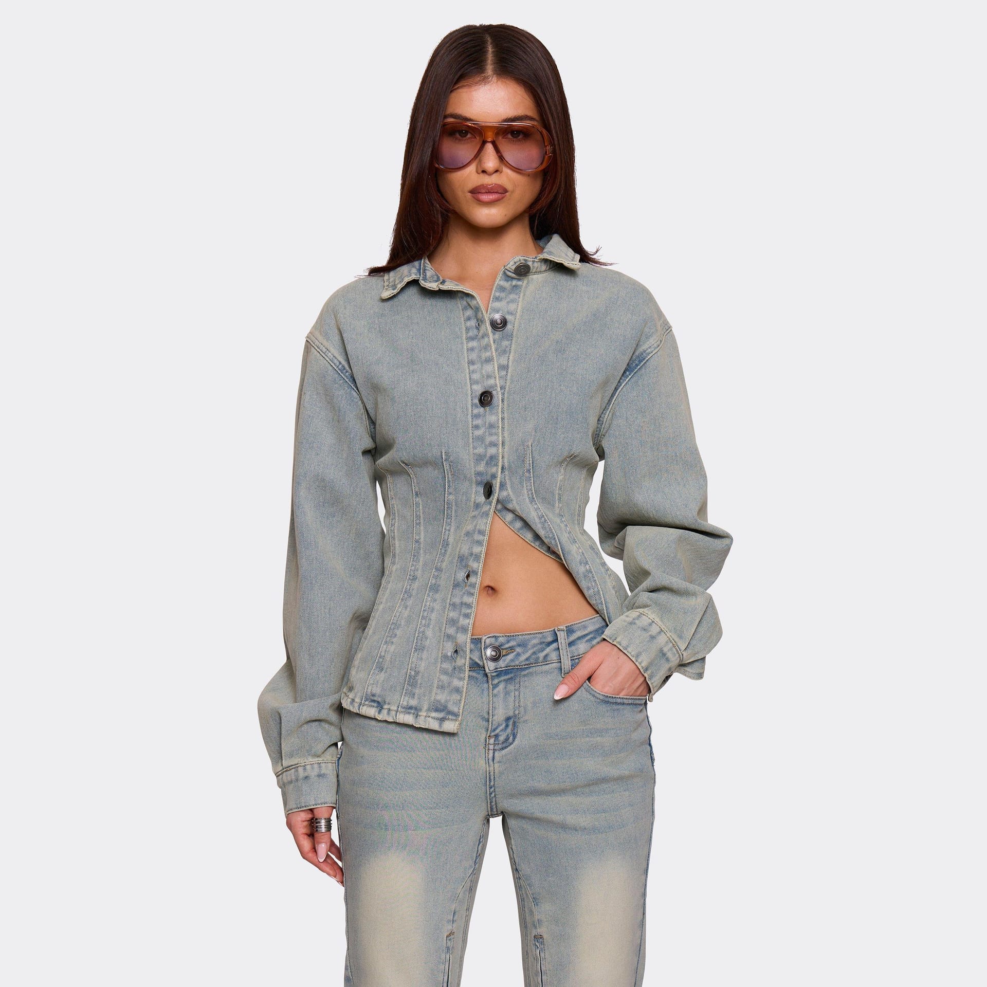 Pair with matching blue washed denim jeans and black ankle boots for a cohesive look.