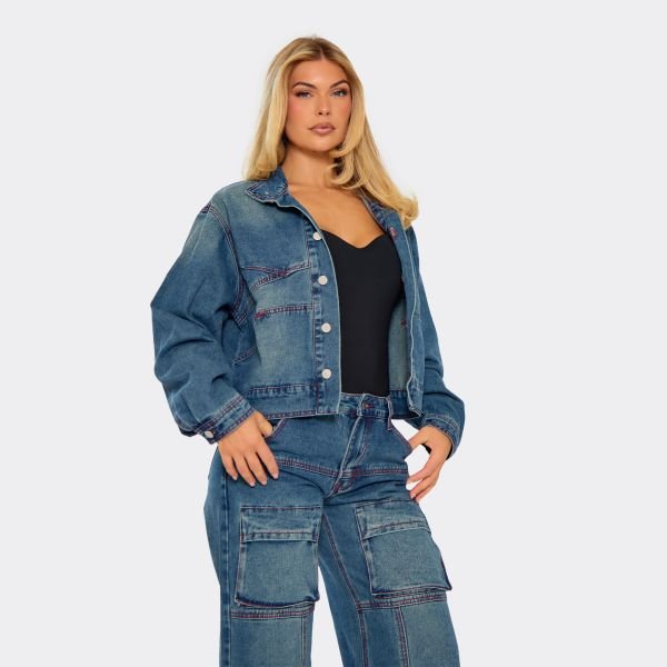 Designed with a dark blue denim finish, this long sleeve jacket features contrast stitch detailing and an oversized fit. Perfect for bringing a fresh, chic vibe to your casual wardrobe.