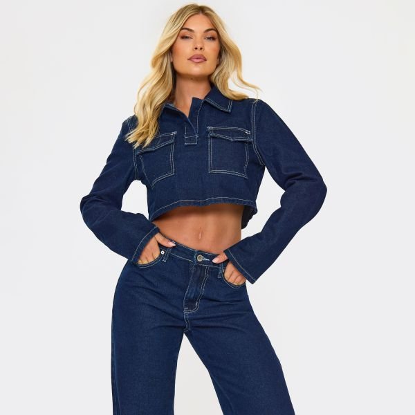 Bring effortless cool-girl vibes to your casual wardrobe with this indigo blue, long sleeve, pocket detailing, cropped, tailored fit, denim fabric top. Designed with a cropped, tailored fit, this top hugs your figure in all the right places.