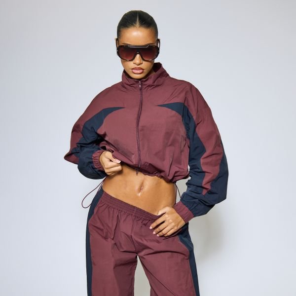 Crafted for casual days, these statement track pants bring on-trend it-girl vibes. Featuring a plum shell material, low rise fit, and wide leg design, the contrast panel detailing adds a modern touch. Style effortlessly with a cropped hoodie and trainers for a relaxed day out or pair with a fitted top and boots for a polished look.