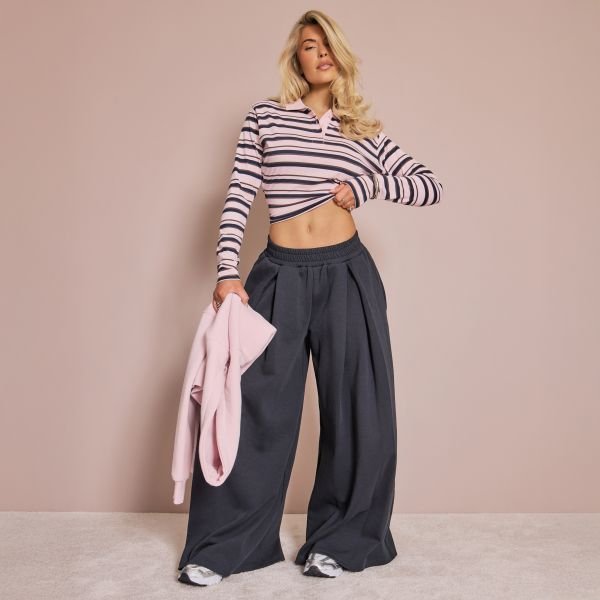 The EGO Low Rise Pintuck Detail Wide Leg Joggers in Navy Blue is ideal for casual, travel.