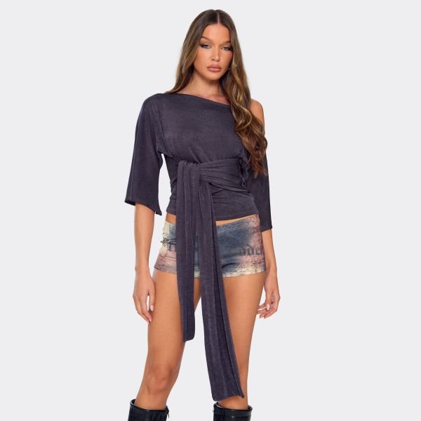 The EGO Asymmetric Navy Blue Short Sleeve Tie Detail Top is ideal for casual, brunch, date-night.