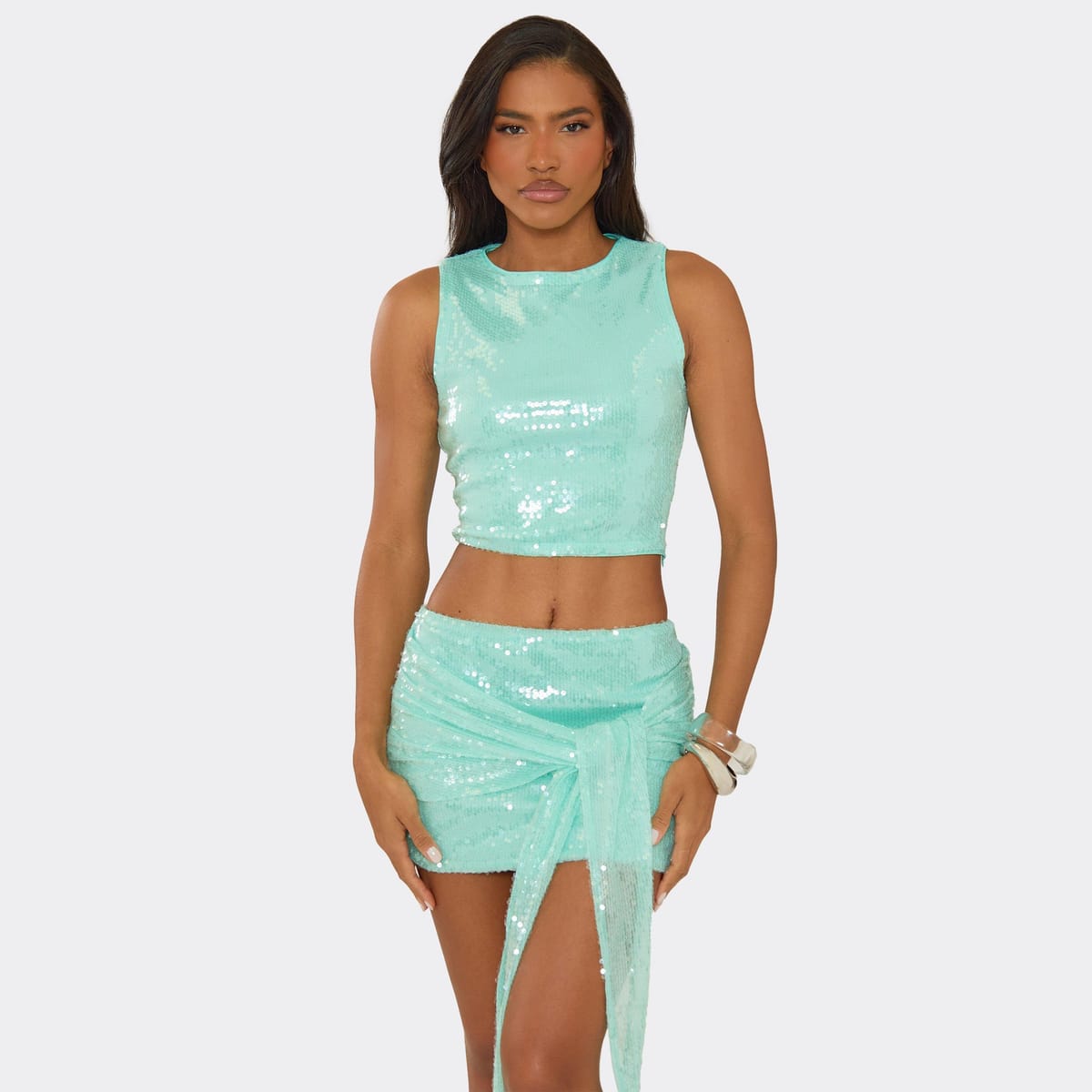 View EGO (UK)'s returns policyFestival-ready blue sequin top with sleeveless vest detailing. Perfect for a party look when styled with denim shorts and cowboy boots.