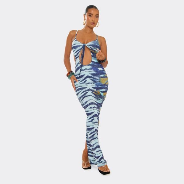 Designed with a sweetheart neckline, spaghetti straps, and cut-out panels, this blue zebra print maxi dress is a statement piece. The tie-front detailing and open back design add a flirty touch, perfect for holiday evenings.