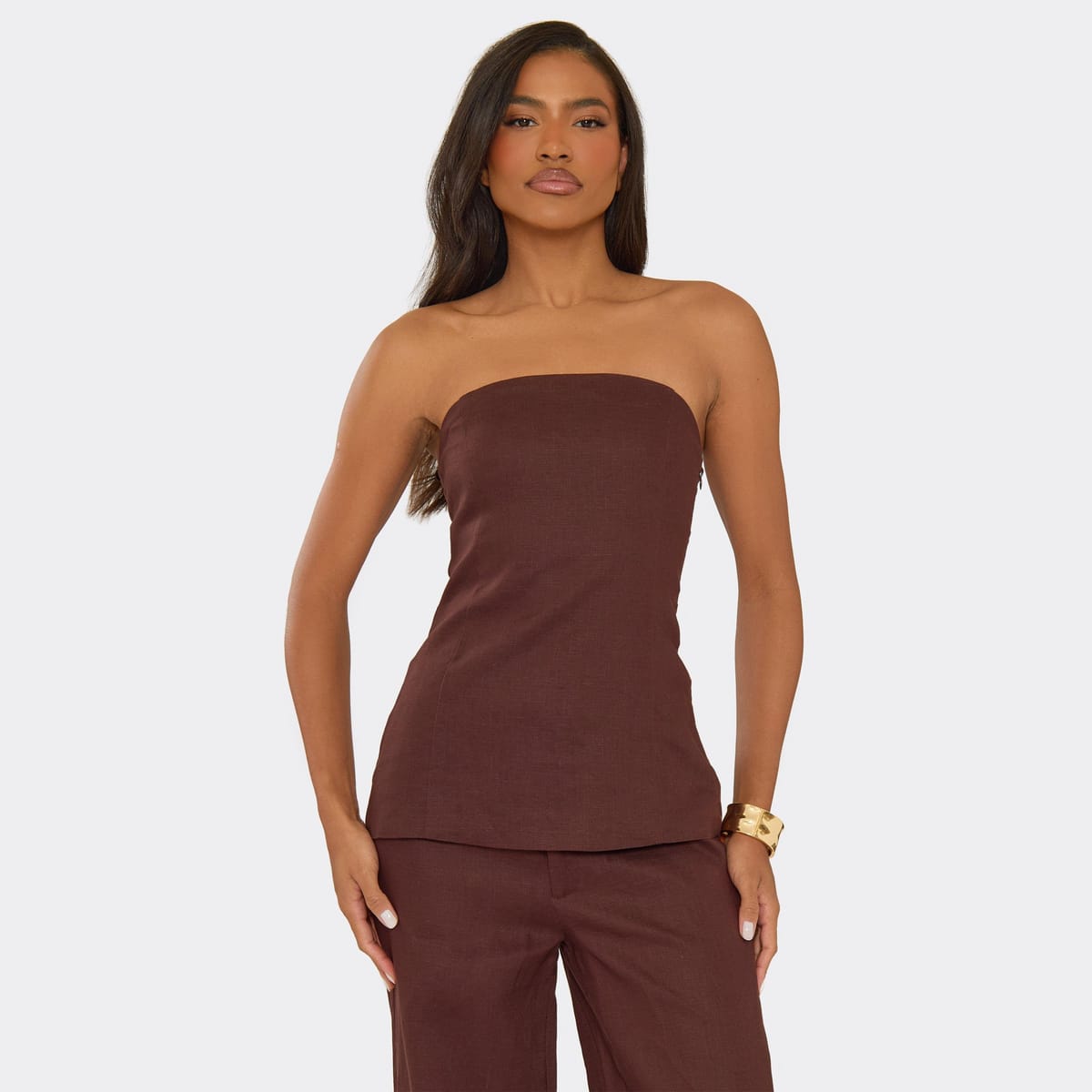 Elegant bandeau longline top in chocolate brown linen by EGO. Perfect for summer nights, style with matching linen trousers and platform sandals for a trendy look.