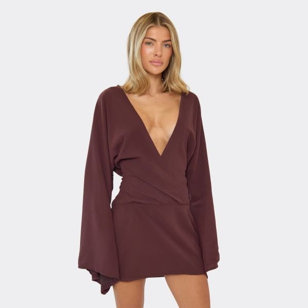 The EGO Batwing Plunge Mini Dress in Chocolate Brown is ideal for evening, party.