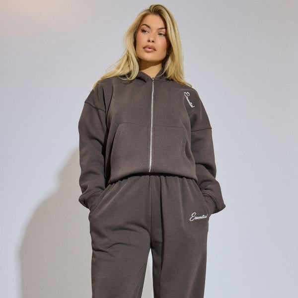 Boxy Oversized Essential Graphic Zip Up Hoodie in chocolate brown brushed cotton with a boxy oversized fit and essential graphic detailing. Style zipped up or layered over basics with joggers or trainers for effortless it-girl energy.