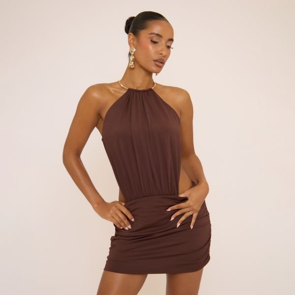 The EGO Halterneck Choker Trim Mini Dress in Brown is ideal for party, date-night.