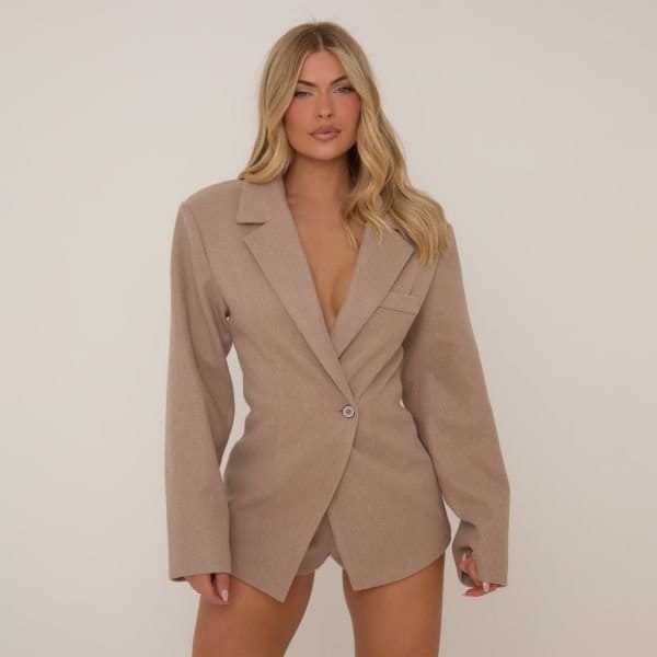 Look sharp, babe! This cinched waist wool-look blazer dress in taupe brown is all about effortless sophistication with a touch of sass. Perfect for turning heads at a work event or a chic night out.