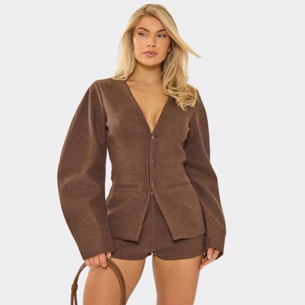Chocolate Brown Wool Look Blazer Playsuit — the ultimate stylish playsuit for casual occasions. Designed in a chic, classic tailoring style with a modern twist, this wool-look blazer features cocoon sleeves and a plunge front. Perfect for casual yet sharp outfits, crafted from lightweight wool-look fabric with a warm, inviting brown color. Ideal for adding a sophisticated touch to your casual wardrobe.