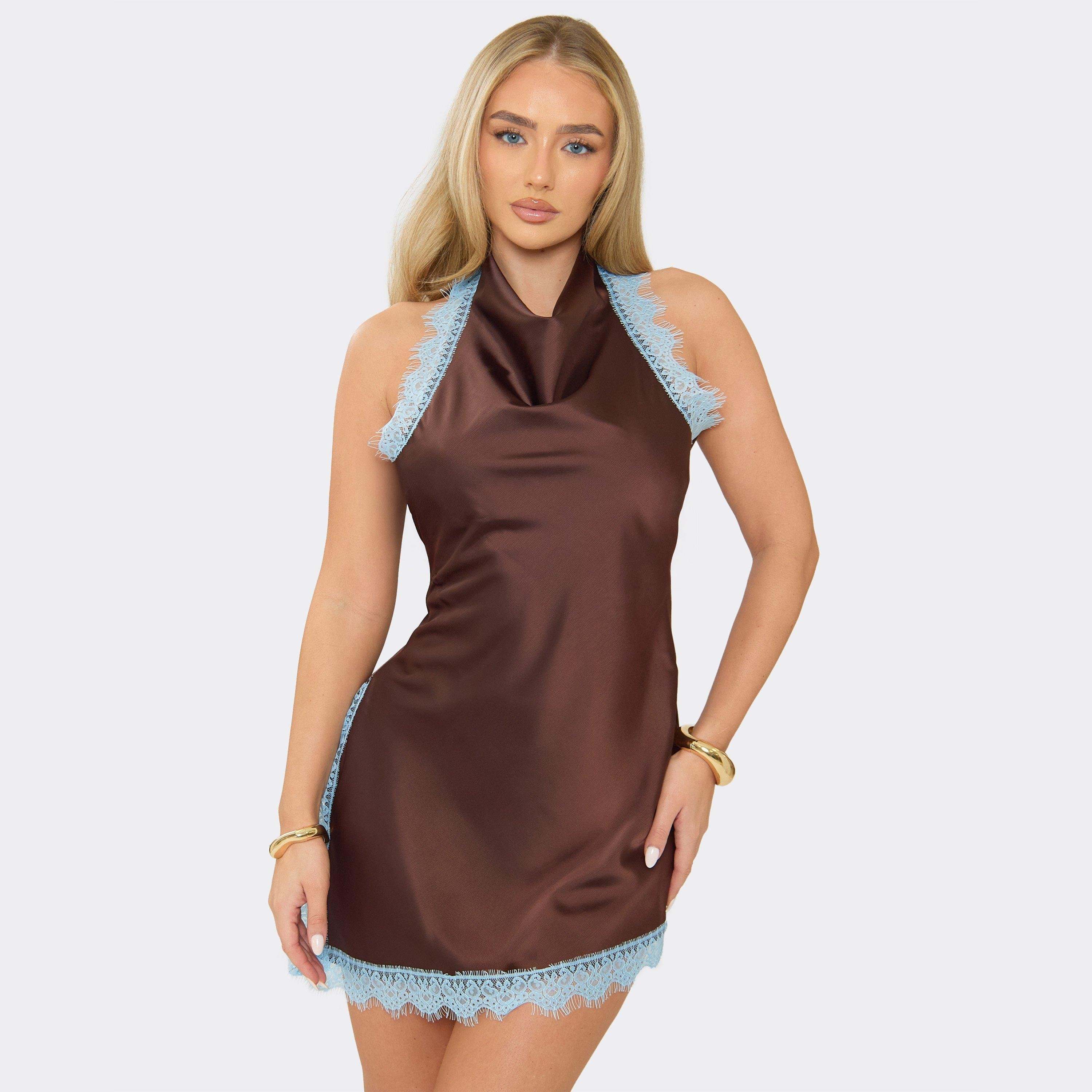 The EGO Brown Satin Cowl Neck Lace Trim Mini Dress is ideal for date-night.