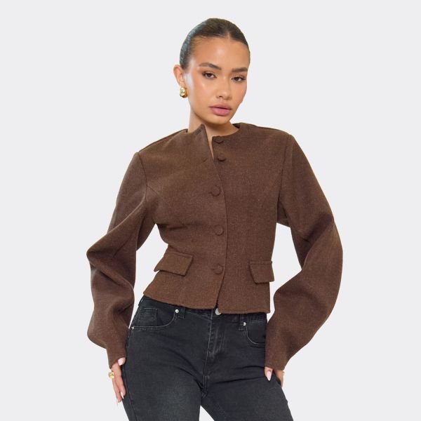 The EGO Crew Neck Button Front Wool Look Blazer in Chocolate Brown is ideal for work, evening.