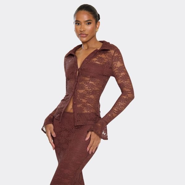 Switch up your bottomless brunch look with this chocolate brown lace shirt. The long, flared sleeve top features sheer, sultry lace, an elegant open collar design, and button-down detailing. Tailored to perfection with a cinched waist, this top enhances your figure and silhouette.