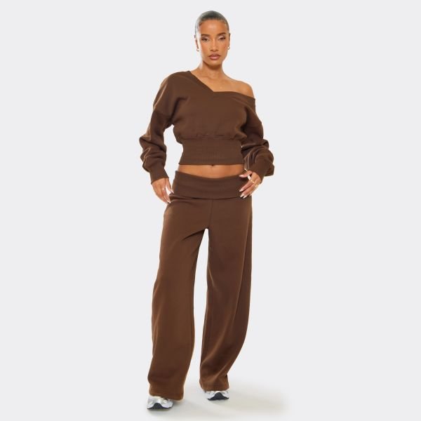 The EGO Fold Over Waist Wide Leg Joggers in Chocolate is ideal for casual, travel, lounge.