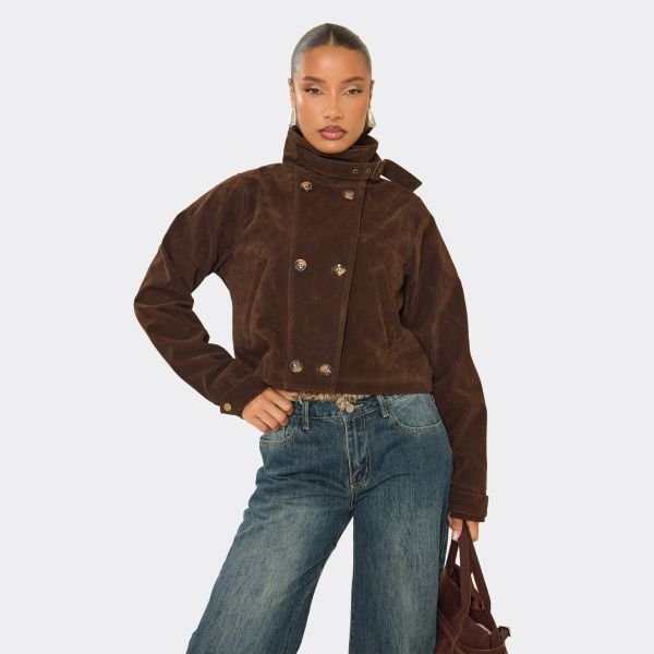 The EGO Funnel Neck Cropped Trench Jacket in Chocolate Brown Suede is ideal for casual, work, evening.