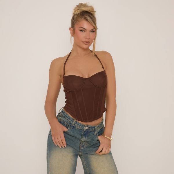 The EGO Halterneck Dipped Hem Corset Top in Chocolate Brown Mesh is ideal for night out, day look.