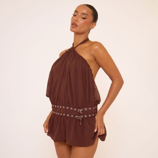 Add some edge with our brown halterneck mini dress featuring an eyelet belt, open back and floaty silhouette in a deep brown hue. Pair this mini dress with knee-high boots for festival fits or rave nights.