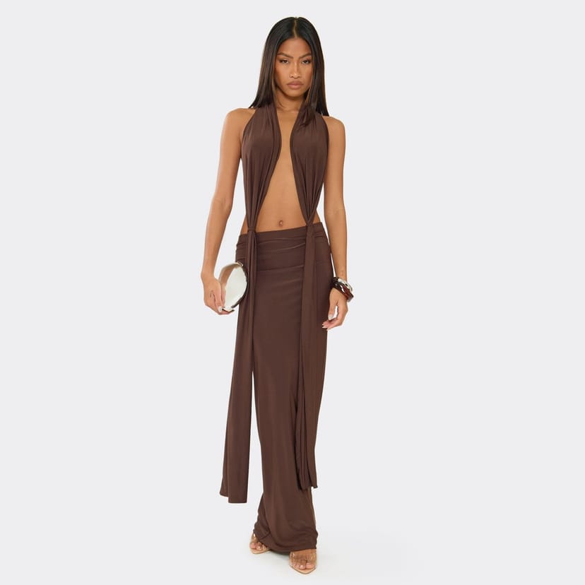 Chocolate Brown Halterneck Plunge Front Knot Detail Maxi Dress — the must-have evening dress for summer soirées. Designed in chocolate brown, this maxi dress features halterneck plunge front knot detailing and a sharp, floor-sweeping fit. Crafted from slinky material, it brings a fresh, it-girl edge to your look. Style with gold platform heels for a clean-chic aesthetic.
