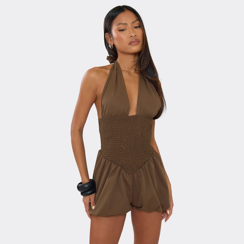 The EGO Brown Shirred Halterneck Puffball Playsuit is ideal for summer party, beach, casual outing.