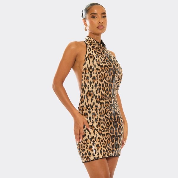 Unleash your wild side in this leopard print sequin mini dress. Sexy and sparkly, this mini dress features a fierce leopard print with light-catching sequins, a high, cowl halter neck and a sexy open-back design. Made from a stretchy, figure-hugging fabric, this leopard print sequin dress is designed with a bodycon style that sculpts your silhouette and contours your curves.
