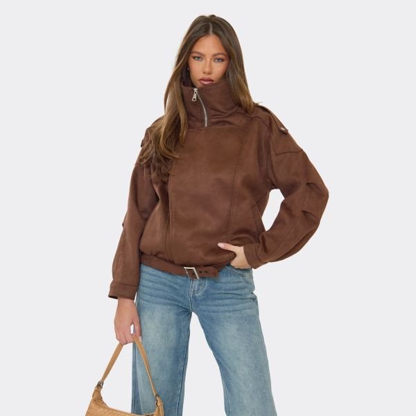 Designed for a modern edge, this chocolate brown faux suede jacket features a high neck and zip-front closure. The long sleeves and tailored bomber fit provide an elevated, structured silhouette, perfect for various occasions.