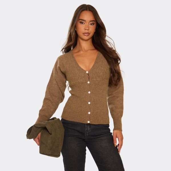 The EGO Long Sleeve Cinched Waist Cardigan in Brown Knit is ideal for casual, work.