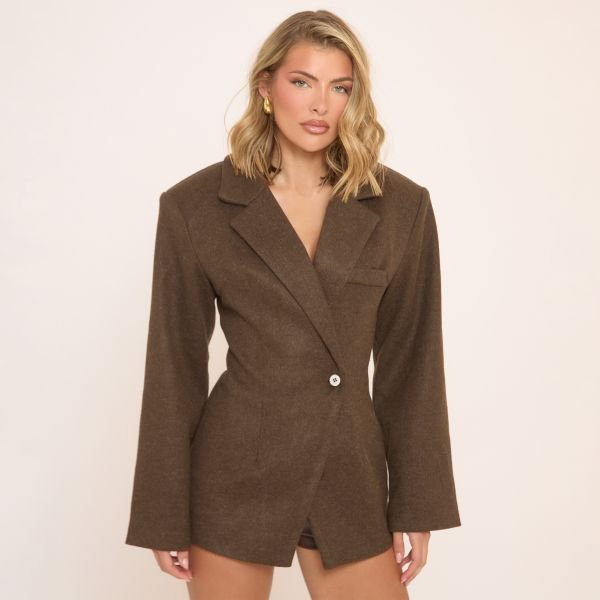 The EGO Long Sleeve Cinched Waist Wool Look Blazer in Brown is ideal for business, smart-casual.