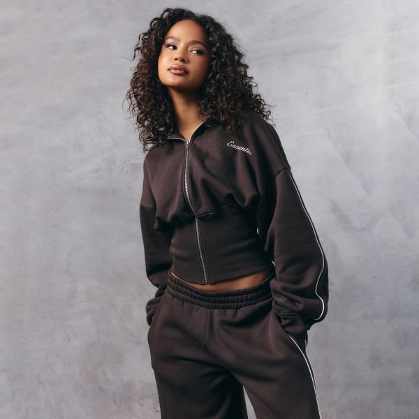 Designed for a casual vibe, this chocolate brown crop zip-up hoodie features contrast stripe and graphic detailing that adds an edgy touch to your look. The cinched waist creates a flattering silhouette, while the zip-up front offers versatility for layering. Ideal for winter, it pairs effortlessly with matching bottoms for a cozy yet stylish outfit.
