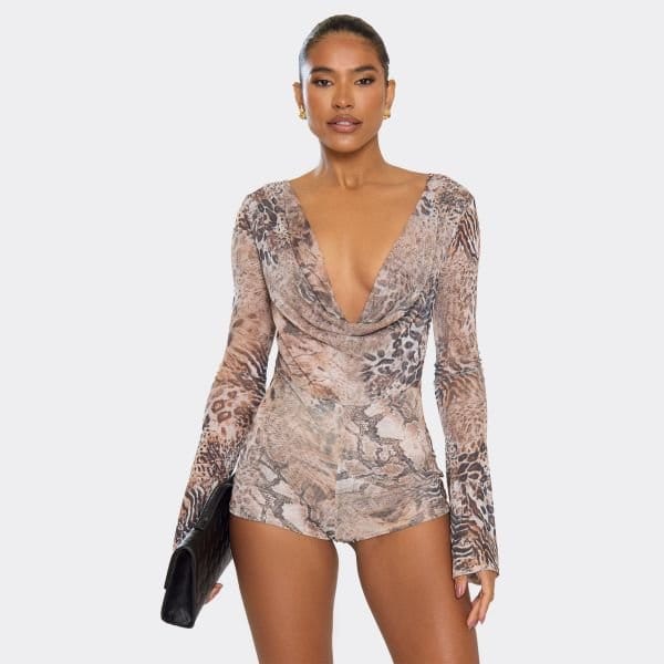 Elevate your evening glam with this chic brown animal print playsuit. Featuring a cowl neck and long sleeves, this piece is designed for bold vibes perfect for your night out.