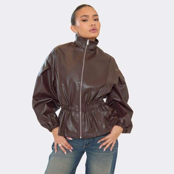 Elevate your cold-weather wardrobe with this chocolate brown faux leather jacket. Designed with a high neck, long sleeves, and a cinched elasticated waist, it offers a sleek finish perfect for layering. Ideal for adding an edgy touch to your outfits.