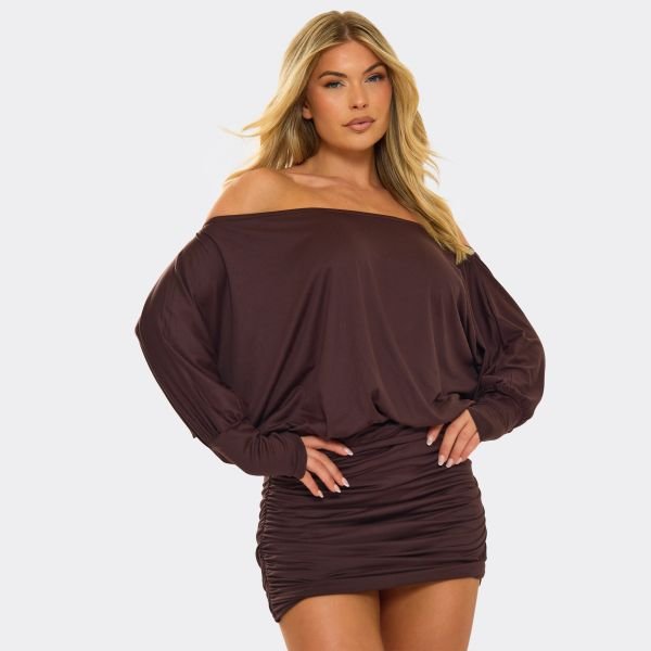 Designed with brown material, this long sleeve mini dress features a slouchy off-the-shoulder design and ruched detailing. Ideal for evening and date-night events.