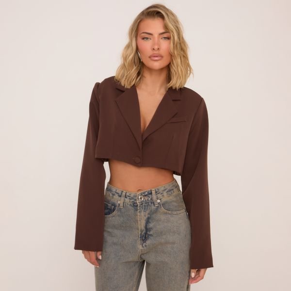 The EGO Long Sleeve Oversized Cropped Blazer in Chocolate Brown is ideal for casual, evening.
