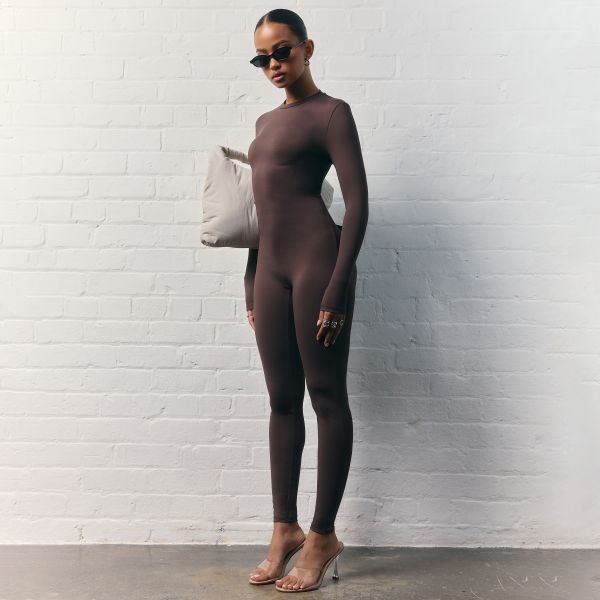 The EGO Long Sleeve Sculpt Fitted Jumpsuit in Chocolate Brown is ideal for date-night, evening.