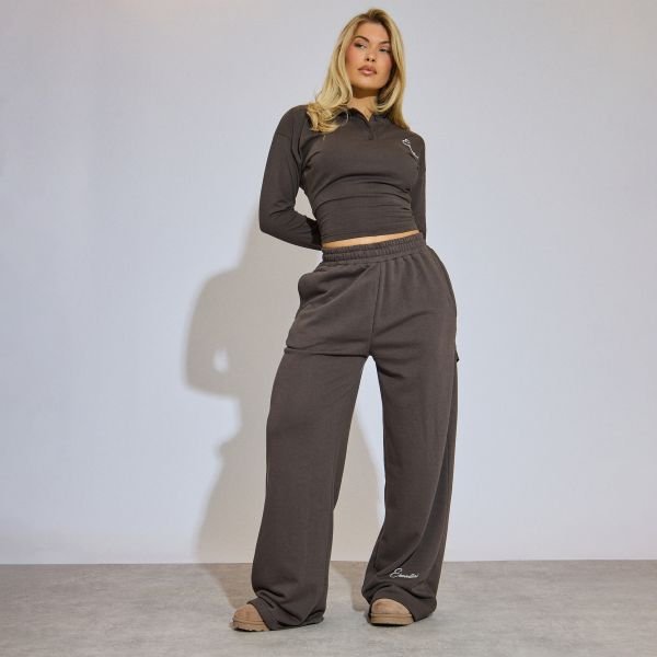 Designed with chocolate brown, soft fleece material, low rise fit, and embroidered straight leg graphic detailing, these joggers are perfect for casual days. Style effortlessly with a cropped hoodie and trainers for a laid-back look or pair with a fitted top and boots for polished plans.