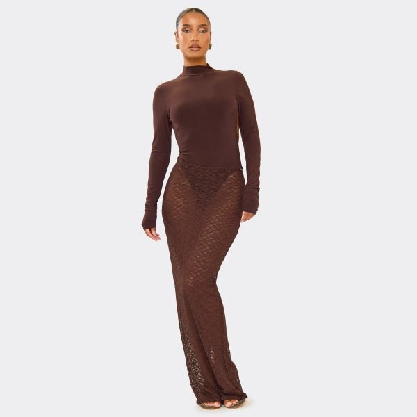 Featuring chocolate brown lace material, this maxi skirt brings elegant, on-trend energy. Perfect for adding a touch of luxe to your evening looks.