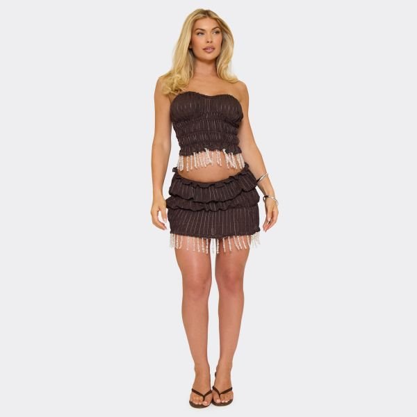 The EGO Chic Mid Rise Beaded Tassel Shorts in Chocolate Textured is ideal for night out.